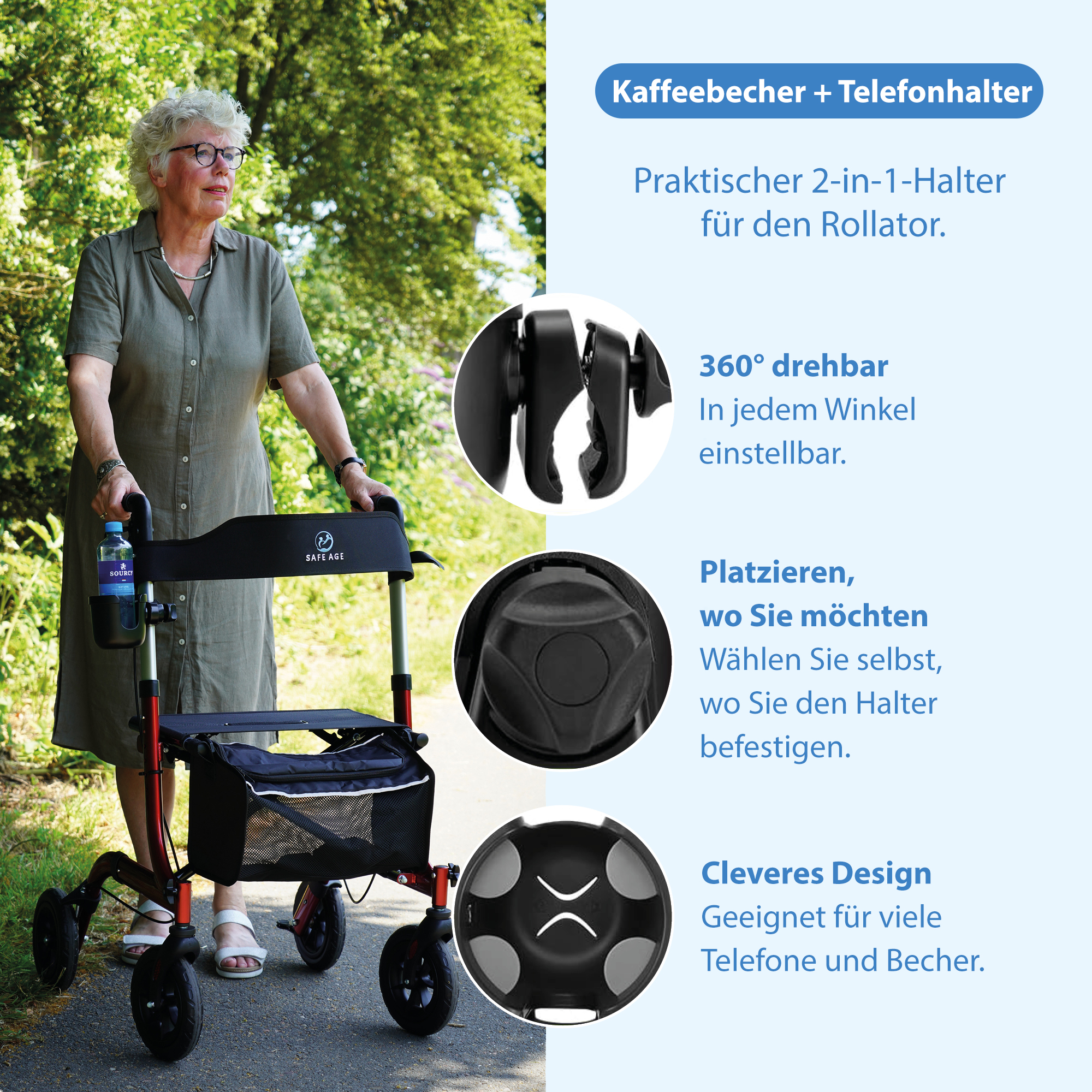 Mit dem Safe Age Becher- und Telefonhalter haben Sie Ihr Getränk und Ihr Telefon immer in Reichweite. Ob Sie mit Ihrem Rollator, Einkaufswagen oder im Rollstuhl unterwegs sind - nehmen Sie einfach Ihren Kaffee, Ihre Wasserflasche oder Ihr Telefon mit. So bleiben Sie sicher und bequem mobil! Der Becher- und Telefonhalter ist auch universell für Kinderwagen, Fahrräder und mehr geeignet!