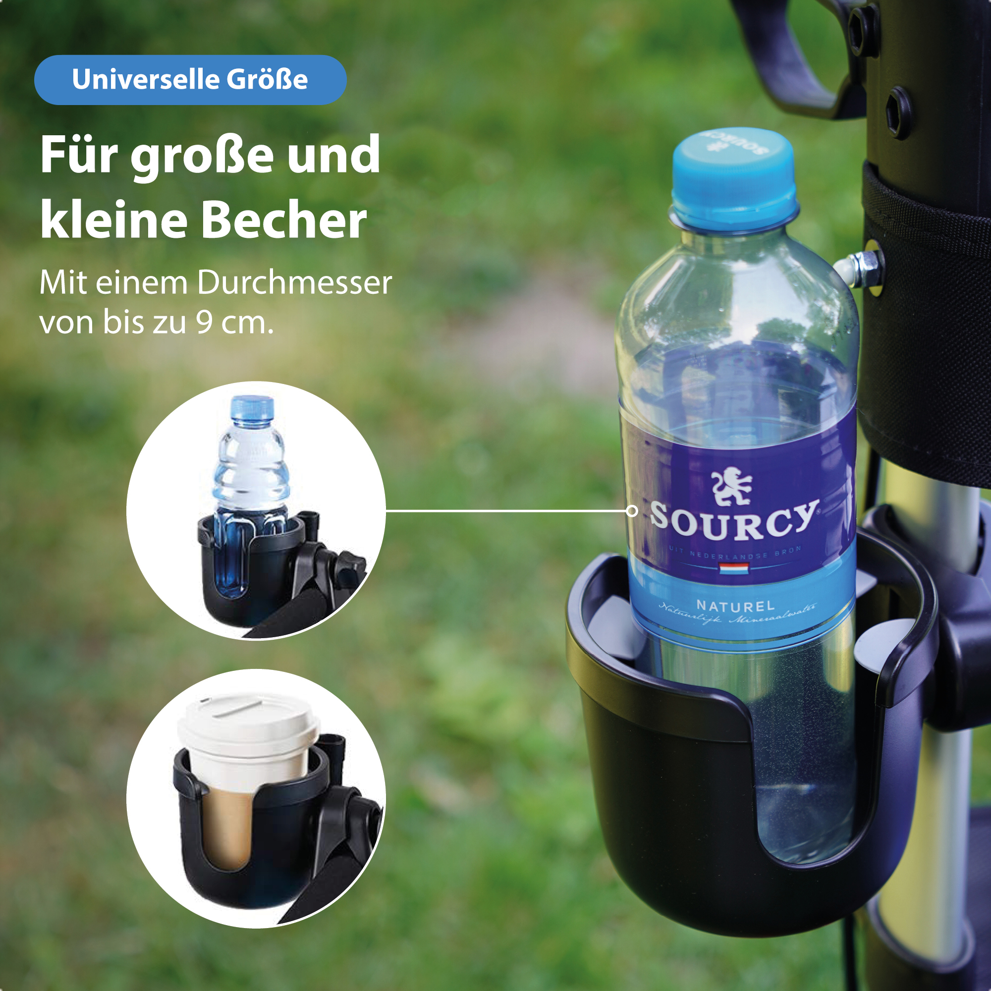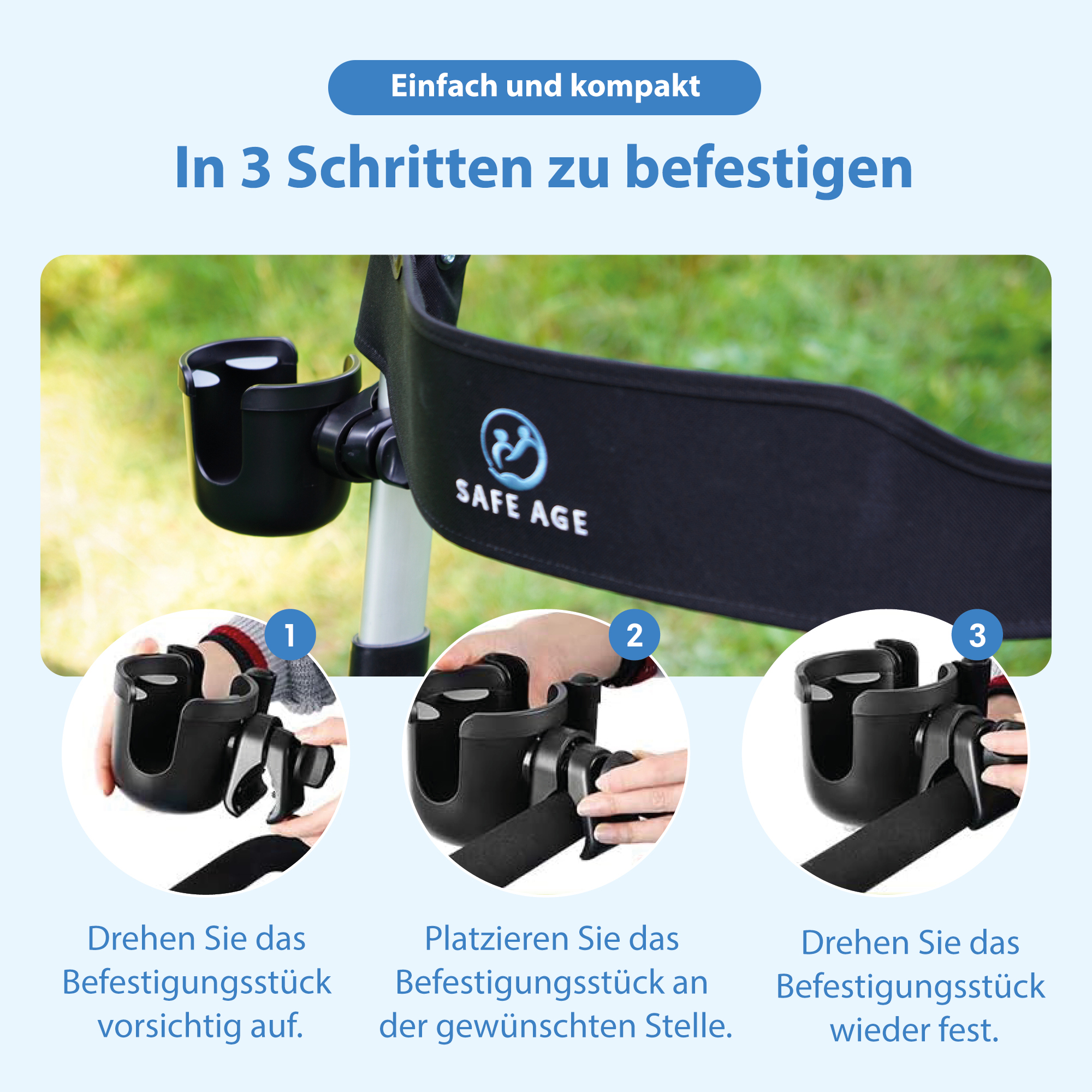 Der Safe Age Becherhalter passt fast überall: am Rollator, Rollstuhl, Fahrrad, Kinderwagen oder sogar am Einkaufswagen. Dank der stabilen Klammer mit Gummigriff bleibt er auch bei Unebenheiten im Straßenverkehr stabil. Durch sein offenes Design ist er für fast alle Trinkbecher geeignet - sogar für Babyflaschen mit Henkel.