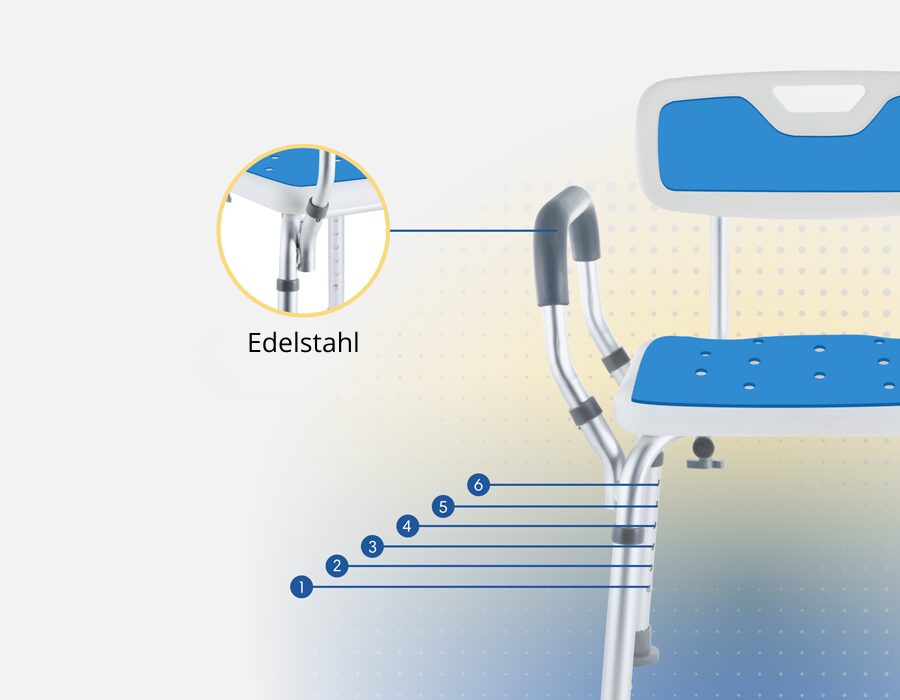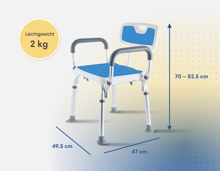 Mit nur 2 kg und kompakter Größe ist der Duschstuhl leicht zu transportieren und passt in die meisten Duschen und Bäder. Sie können den Duschstuhl mit 6 verschiedenen verstellbaren Sitzhöhen leicht an Ihre Bedürfnisse anpassen.