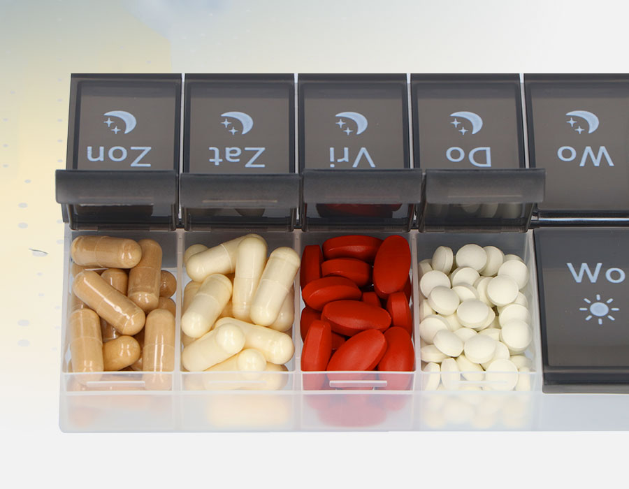 - XL extra grote vakken. Je kunt tot wel 14 visolie / 17 vitaminepillen per vak kwijt!
