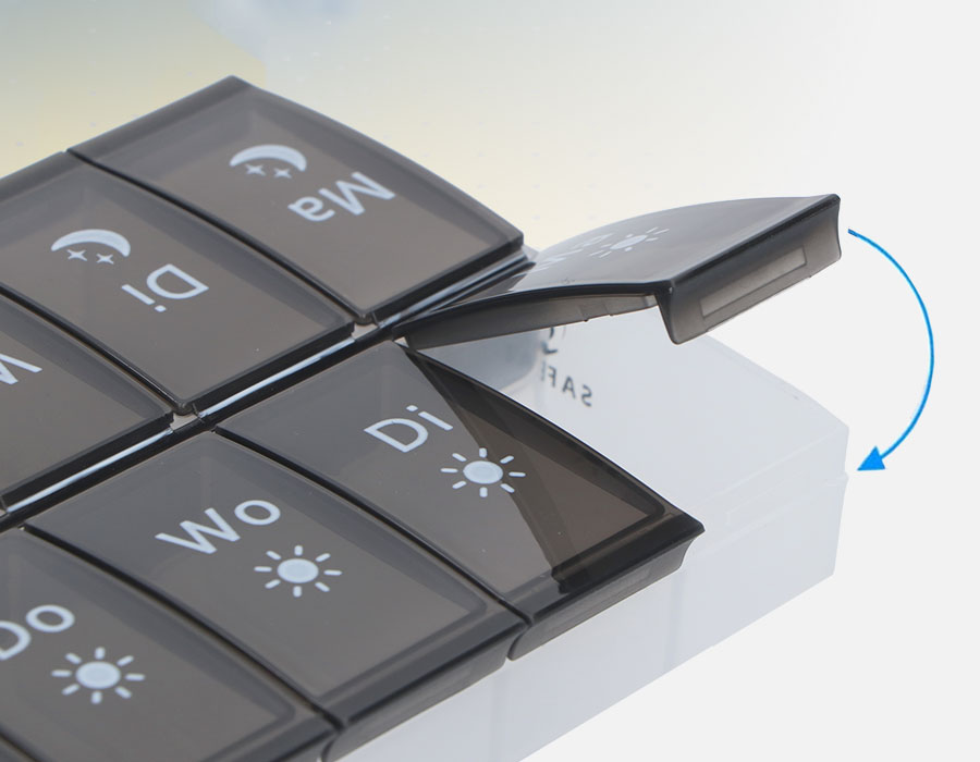 - Inhoud duidelijk zichtbaar. De onderkant is doorzichtig. Zo kun je altijd van buitenaf zien hoeveel pillen er nog in het vakje zitten zonder hem open te doen.