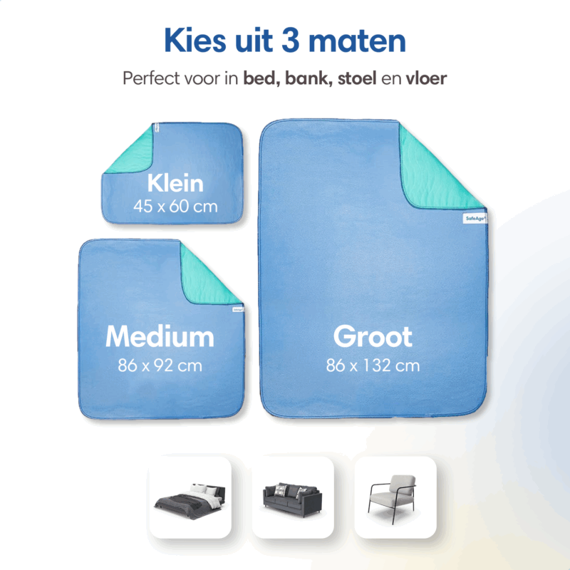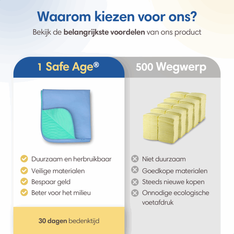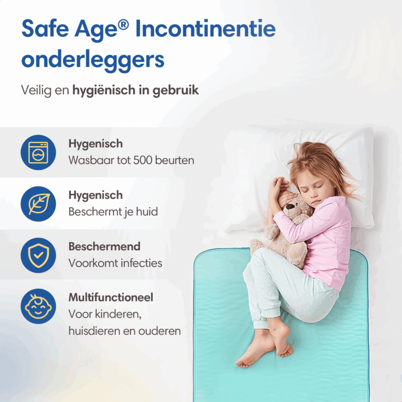 - Multifunctioneel gebruik. Gebruik de onderleggers voor babyโs, kinderen, volwassenen, ouderen en huisdieren. Verleng de levensduur van uw bed en meubels. Incontinentie is geen probleem meer met de Safe Age wasbare incontinentie onderleggers!