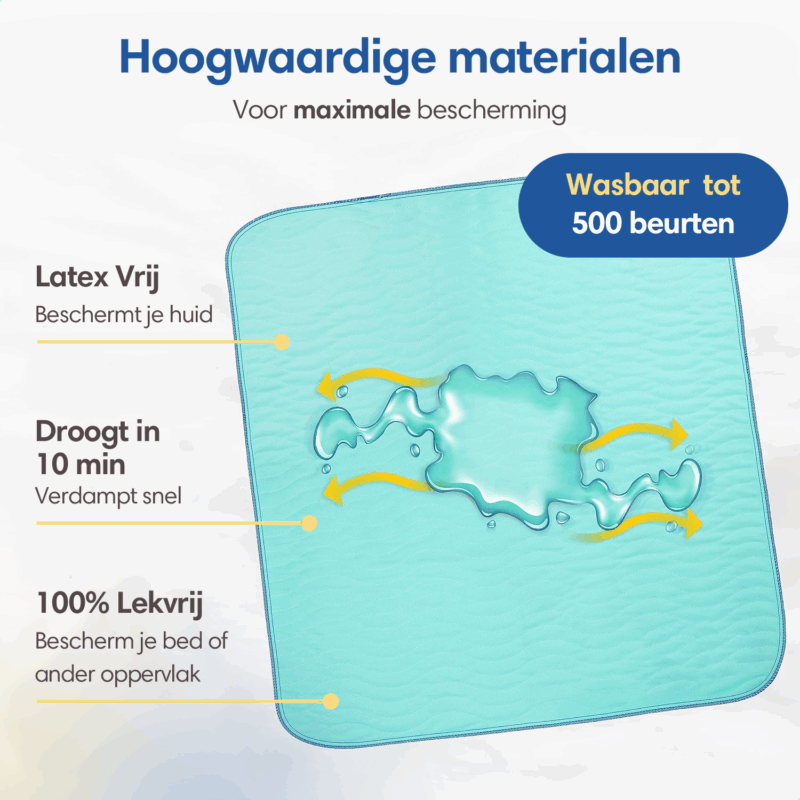 Het duurzame ontwerp droogt in 10 minuten, kan tot 500 keer gewassen worden en beschermt de huid tegen vocht en infecties. Gebruik de onderleggers in bed, stoel, banken of bij huisdieren voor optimale bescherming. Een voordelige en milieuvriendelijke keuze voor langdurig gebruik!