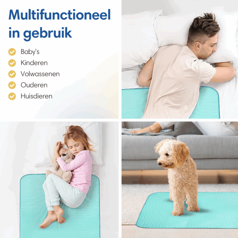 De Safe Ageยฎ wasbare incontinentie onderleggers zijn lekvrij en bieden maximale vochtopname voor kinderen, volwassenen en huisdieren.