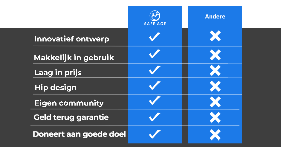 Een hulpmiddel hoeft niet saai en duur te zijn. Bij Safe Age is onze missie helder: we willen de kwaliteit van leven verbeteren voor zoveel mogelijk mensen. Met onze producten zorgen we ervoor dat iedereen veilig, comfortabel en zo zelfstandig mogelijk kan leven – zonder dat daar hoge aanschafkosten of maandelijkse lasten aan verbonden zijn.