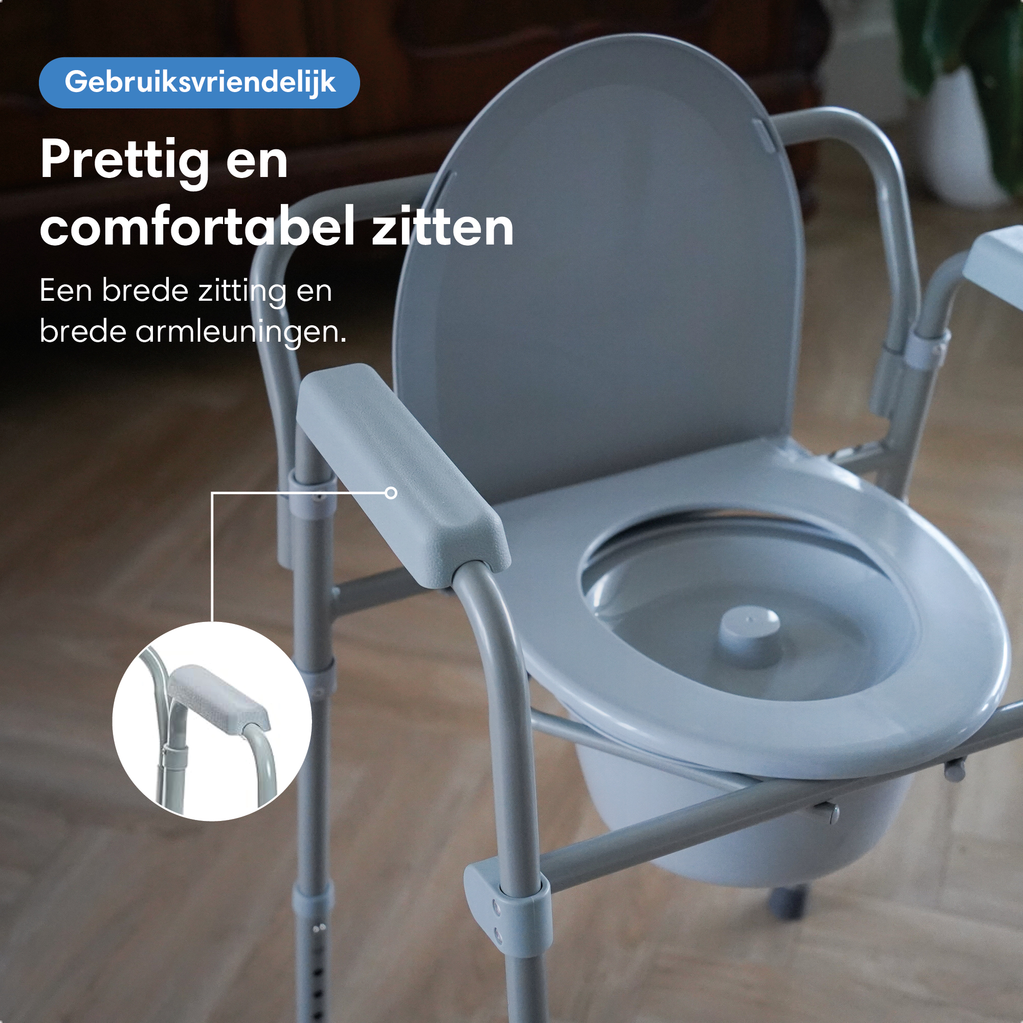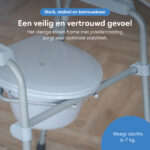 Stevige stalen constructie met antislip poten en stabiele armleuningen voor maximale veiligheid bij zitten en opstaan. Ideaal bij herstel of verminderde mobiliteit. De brede, comfortabele zitting zorgt voor stabiel en zorgeloos gebruik – zonder wiebelen of onzekerheid.