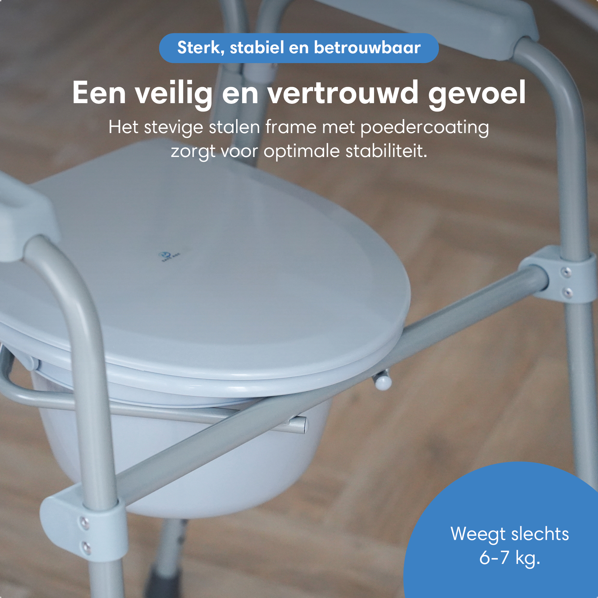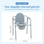 De toiletstoel heeft een sterk stalen frame en stabiele poten met antislip doppen. Hierdoor staat hij stevig en veilig tijdens het zitten en opstaan.