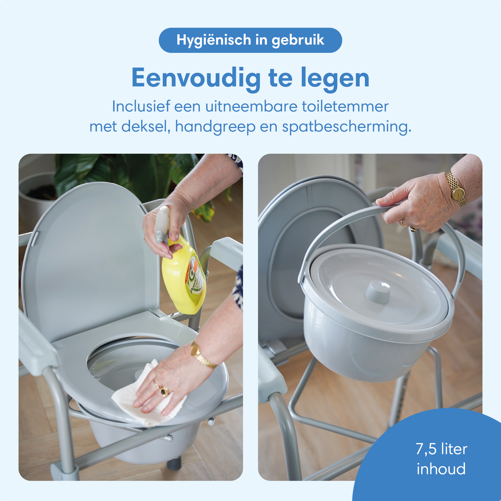 Gebruik de stoel mét of zonder emmer, afhankelijk van jouw situatie.