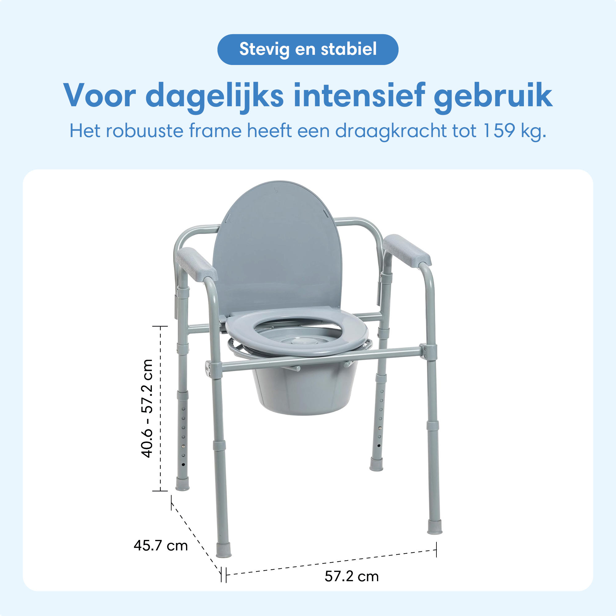 De toiletstoel is ontworpen voor intensief dagelijks gebruik en heeft een hoog draagvermogen tot circa 160 kg.